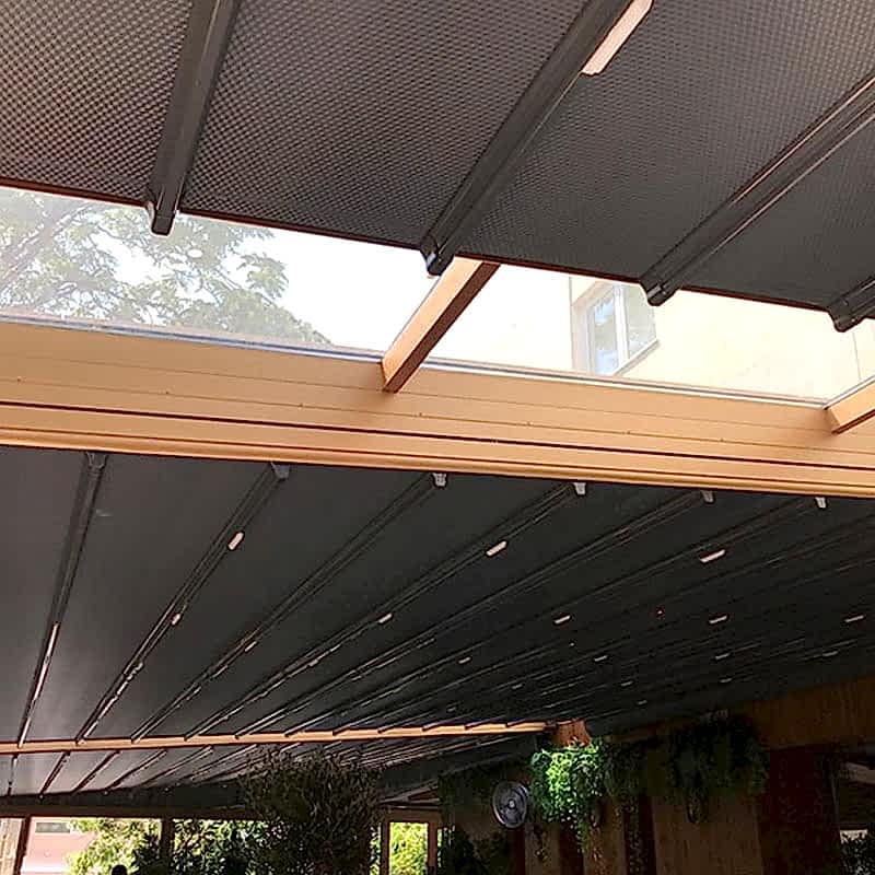Hareketli tavan örtü malzemesi Alman Mehler marka İspanyol Loncar ve PVC esaslı, 800gr/m2 gramajlı, üç katmandan oluşan block out (ışık geçirmeme) özelliklidir. Ayrıca su geçirmeme, alev yürütmeme özelliğine sahiptir. Standart olarak Krem ve Beyaz renklerde üretilmektedir. Bugüne kadar yaptığımız projeler içerisinde her geçen gün yaşam kalitesini artıran, sadece pergola olmaktan öte, yaşam standartlarını ve tarzını değiştiren tente ve pergola sistemleri projelerimiz size benzersiz bir konfor seviyesi sunar.